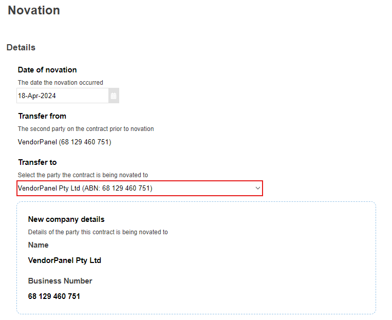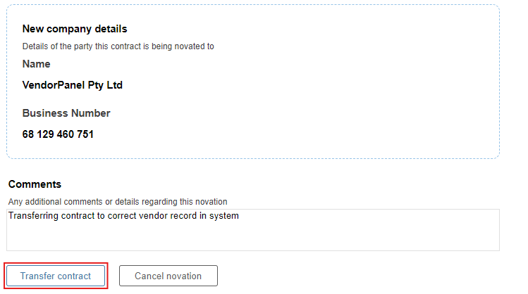 Press the Transfer contract button. The linked vendor will automatically be updated to the one selected on the novation.