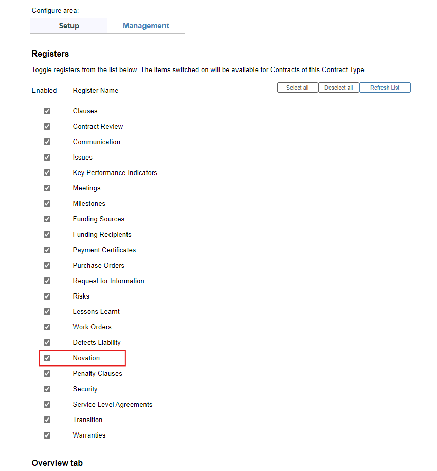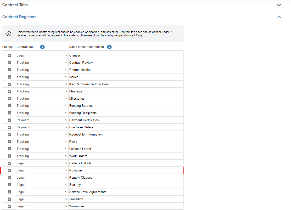 - The Novation register must be enabled for the Contract Management module & Contract type(s).